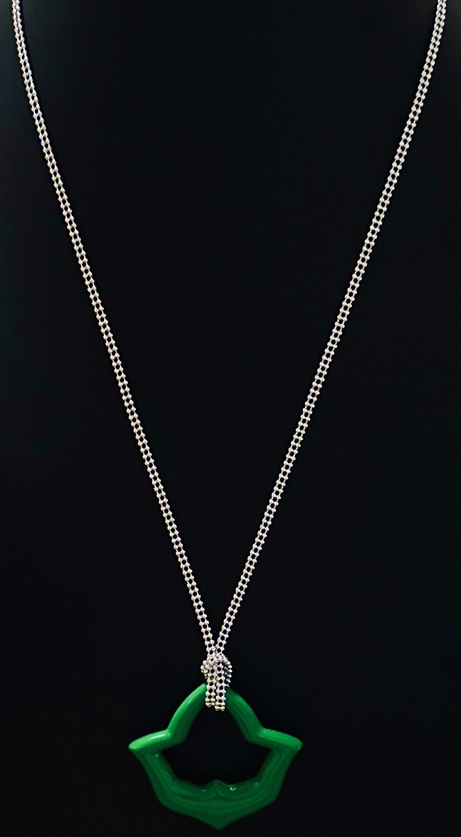 Green Porcelain Ivy Necklace with a Glossy Finish and 24 Inch chain. The Green Porcelain Ivy Charm is 2 inches tall and wide and .25 of an inch in diameter. Made of Porcelain and the Chains are Brass. Both the Gold and Silver Color Chains are included in your purchase for your versatility.