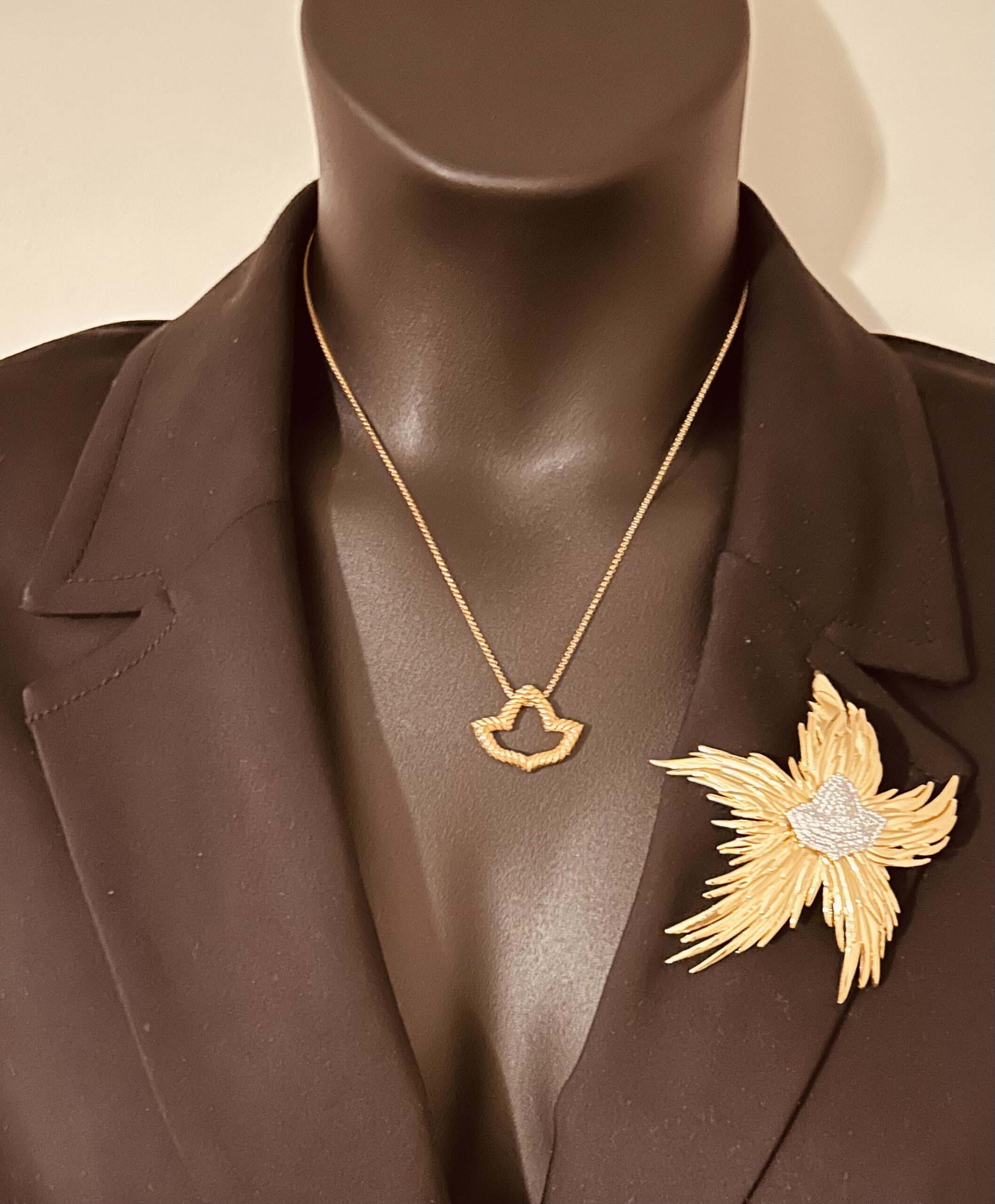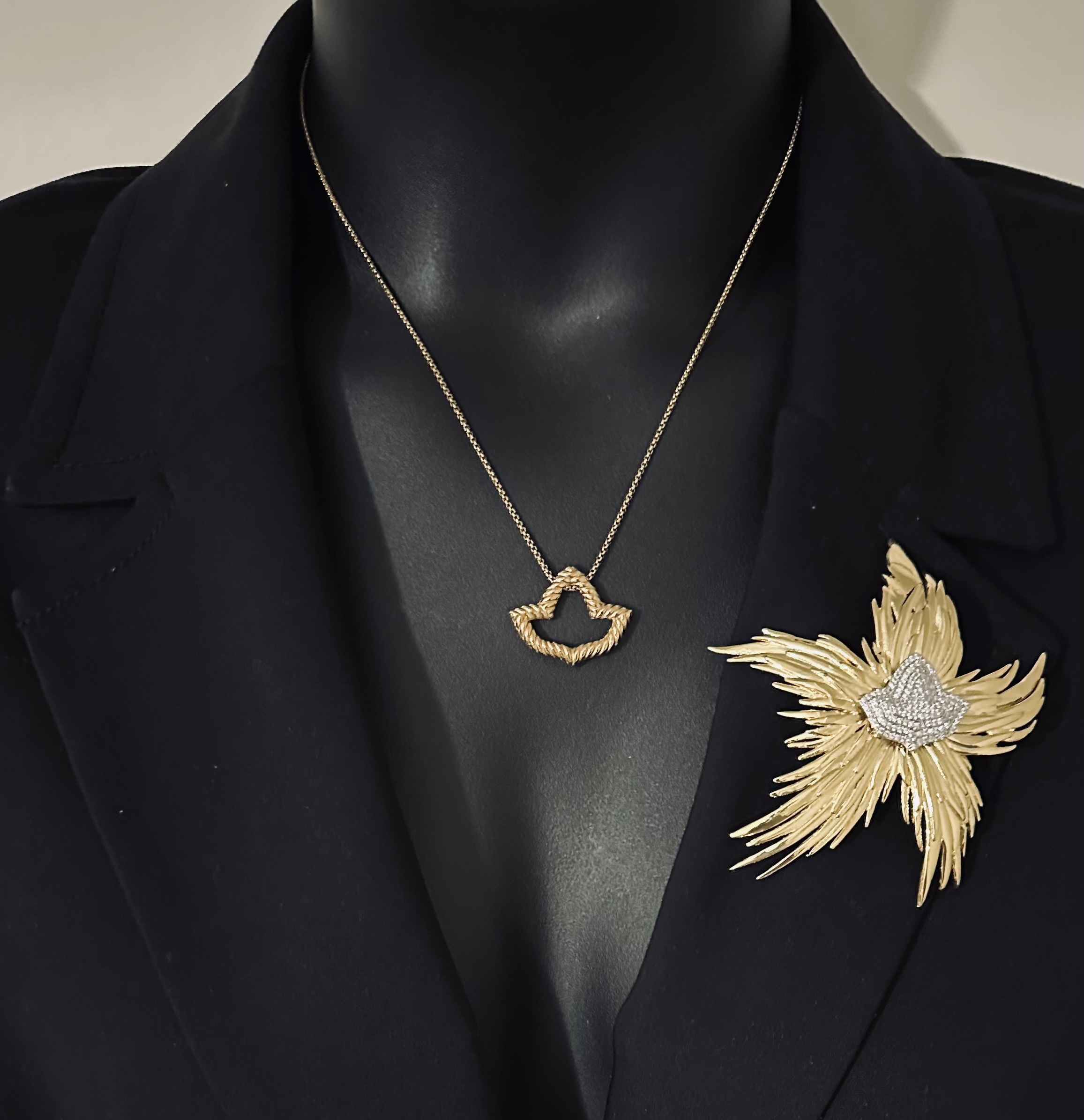 This Beautiful Gold and White Rhinestone Ivy Flame Brooch is made of Brass Metal which is extremely durable, resistant to scratching and bending and will last a lifetime. It is 3 inches wide and 3.5 inches tall. It has four levels of graduated Ivies with white rhinestone accents in the middle. This is a piece that you will want in your collection forever.