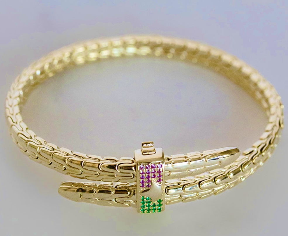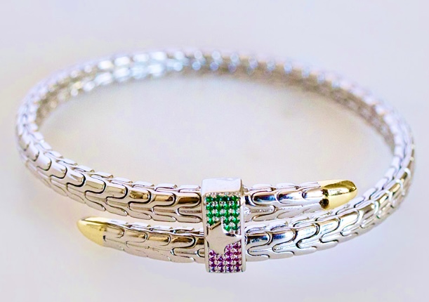 Bold and Sexy, The “Pretty Girl” Spear Bracelet with Pink and Green Rhinestones. Choose 925 Sterling Silver or 14 Carat Gold Overlay. Great for any size wrist. Adjustable.