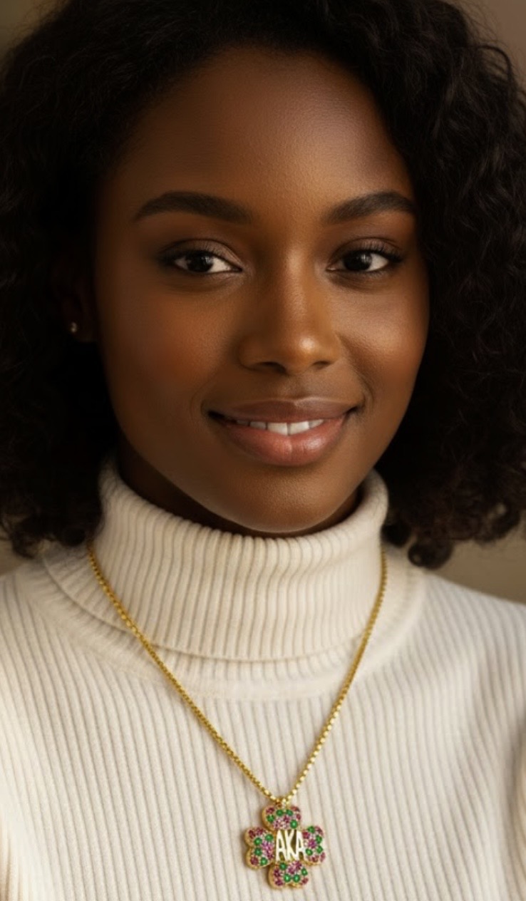 Carry the legacy of sisterhood close to your heart with this exquisite gold-tone pendant necklace. This piece is a masterclass in “Antique Chic,” designed specifically for Sorors who appreciate a timeless, heirloom aesthetic combined with the vibrant pride of Alpha Kappa Alpha. The necklace chain and pendant is brass with and pink and green 5A rhinestones.