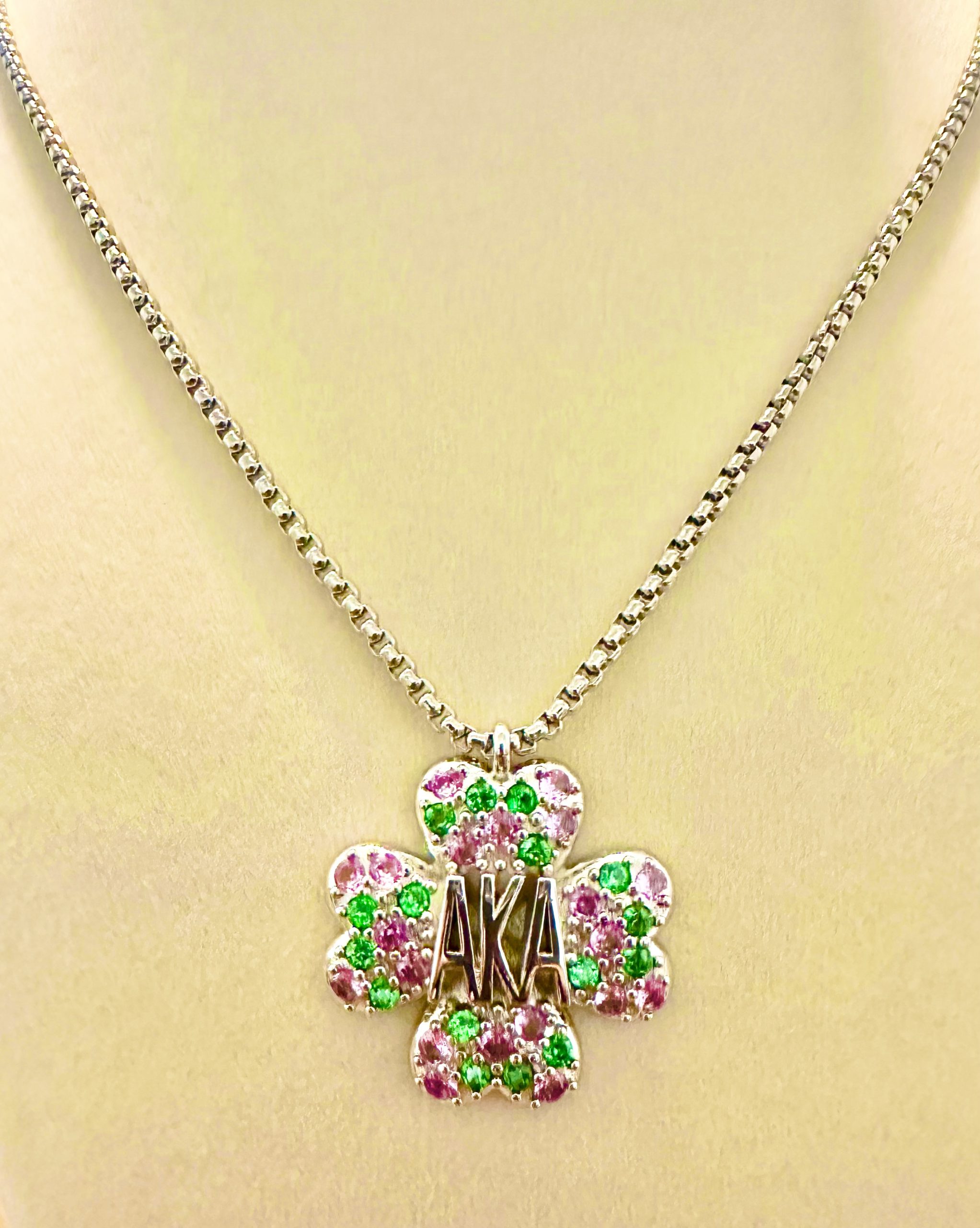 Carry the legacy of sisterhood close to your heart with this exquisite silver-tone pendant necklace. This piece is a masterclass in “Antique Chic,” designed specifically for Sorors who appreciate a timeless, heirloom aesthetic combined with the vibrant pride of Alpha Kappa Alpha. The necklace chain and pendant is brass with and pink and green 5A rhinestones.